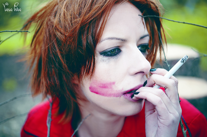 В четверг снимала свою Анетту в роли сумашедшей, такой уж у нее был настрой. Покололись об крапиву, вытаскивали шишки из волос, пачкались красной помадой, спотыкались и падали в сосновом лесу. Вот результат: